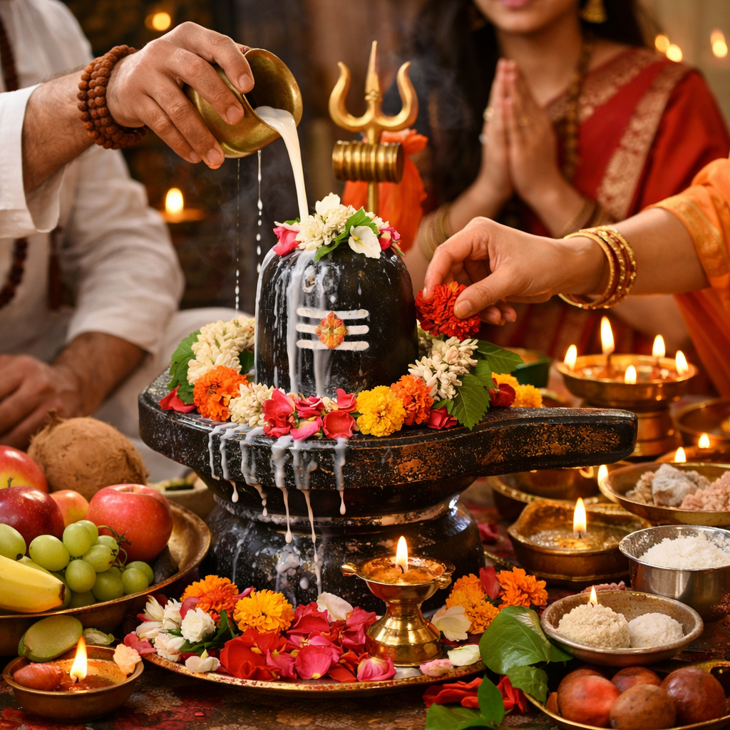 Water, milk, curd, ghee, honey, Ganga water, Bilva leaves, white flowers, and sacred ash are offered.